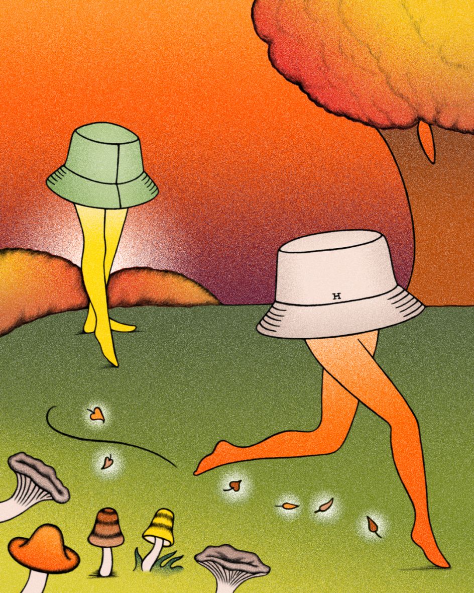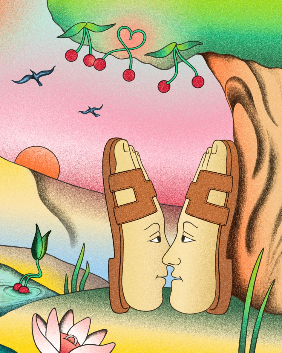 Linda Merad, una ilustradora francesa con sede en París, es una de esas artistas. En 2025, fue contactada para crear ilustraciones para la cuenta de Instagram de la marca, produciendo una serie de piezas coloridas y llenas de texturas, con hermosos guiños a la naturaleza y personajes juguetones – zapatos besándose, humanos en forma de hongos, y experimentos con litografía. Hermès quedó tan impresionada que la directora de arte, Rachel Cazadamont, solicitó más y pidió a Linda que realizara una animación utilizando su estética litográfica característica.
